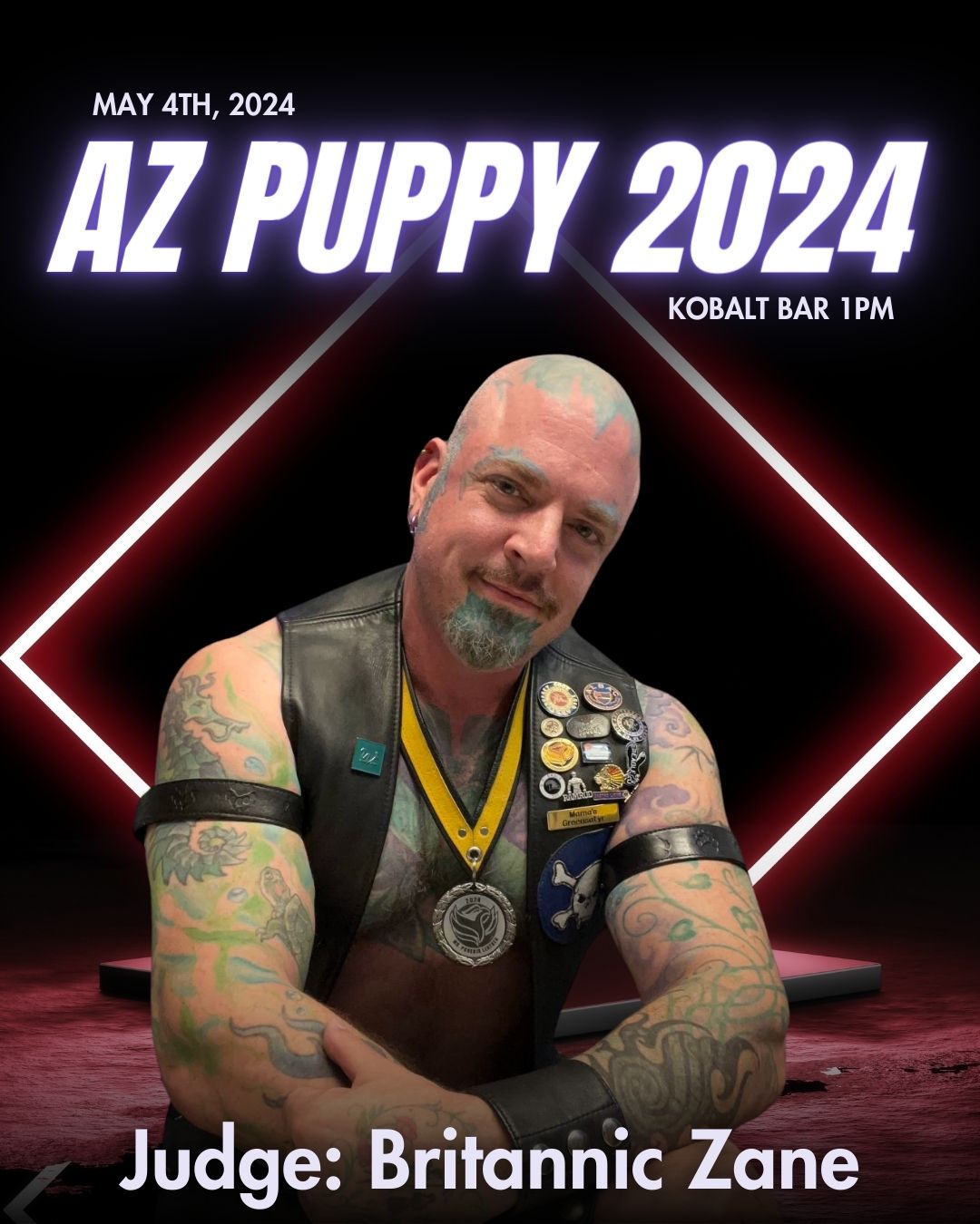 Read more: AZ Puppy 2024 Judge: Britannic Zane aka PupKakeMeet 2024 AZ Puppy Judge, Britannic Zane, aka PupKake, Mr Arizona Leather 2024! “Brit Zane has an extensive background in the BDSM / Leather scene that started in 1988. After co-organizing the annual B&D fetish fashion balls and weekly night club kink nights at Manray in Cambridge, Brit started to branch out within the community…