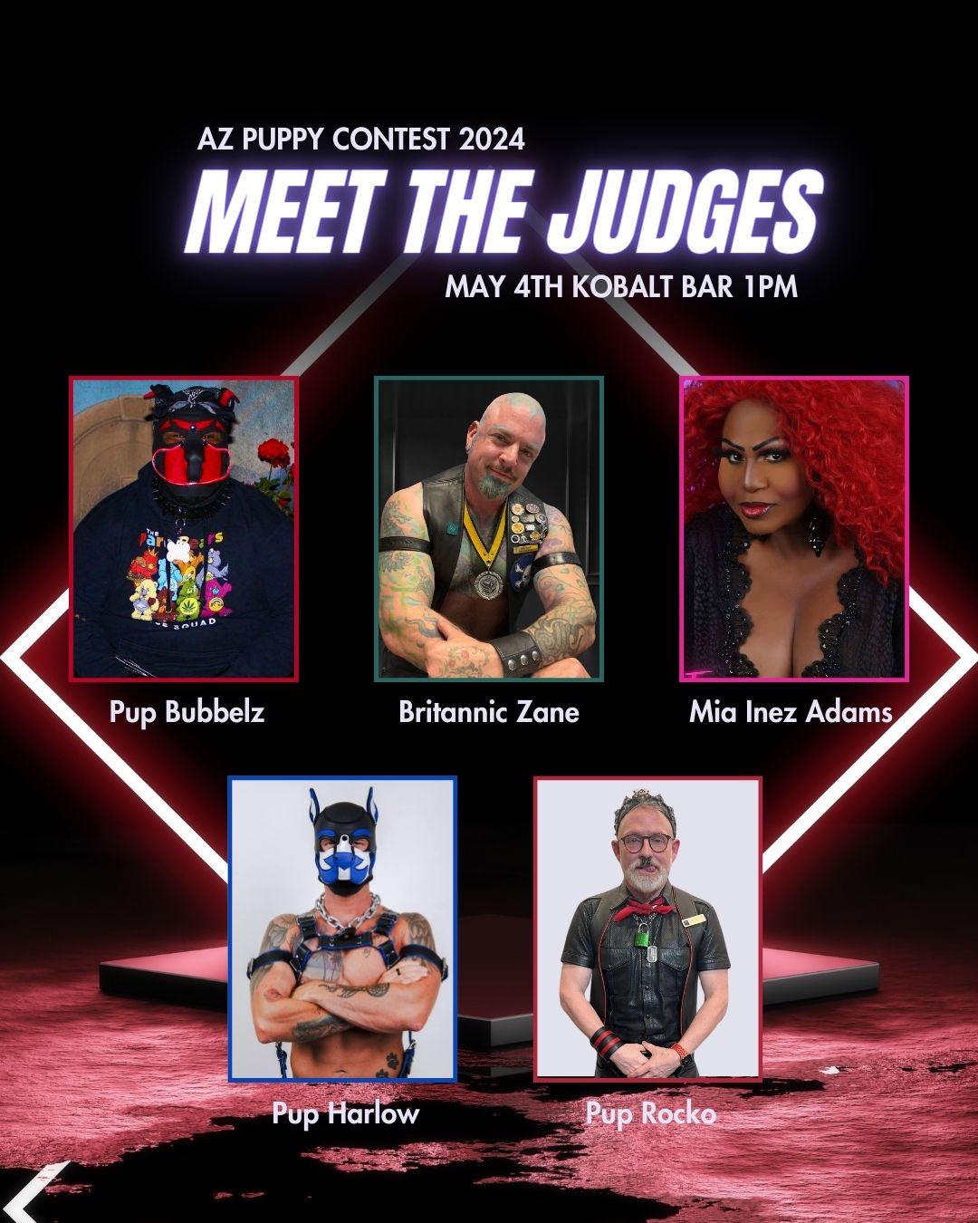 Read more: Your AZ Puppy Contest 2024 JudgesMeet our judges for the inaugural AZ Puppy Contest 2024. These five judges represent excellence in our queer community both locally and regionally. They will judge our competition with an emphasis on selecting the best, not the crowd favorite. We can’t wait to see who they select! Your AZ Puppy Contest 2024 Judges are: